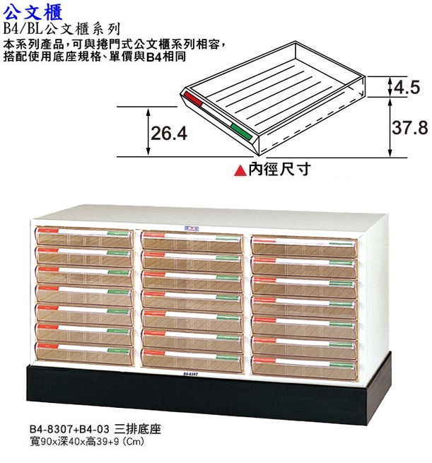 [B4-8307+B4-03 三排文件櫃+底座]. 寬90x深40x高39+9(Cm).