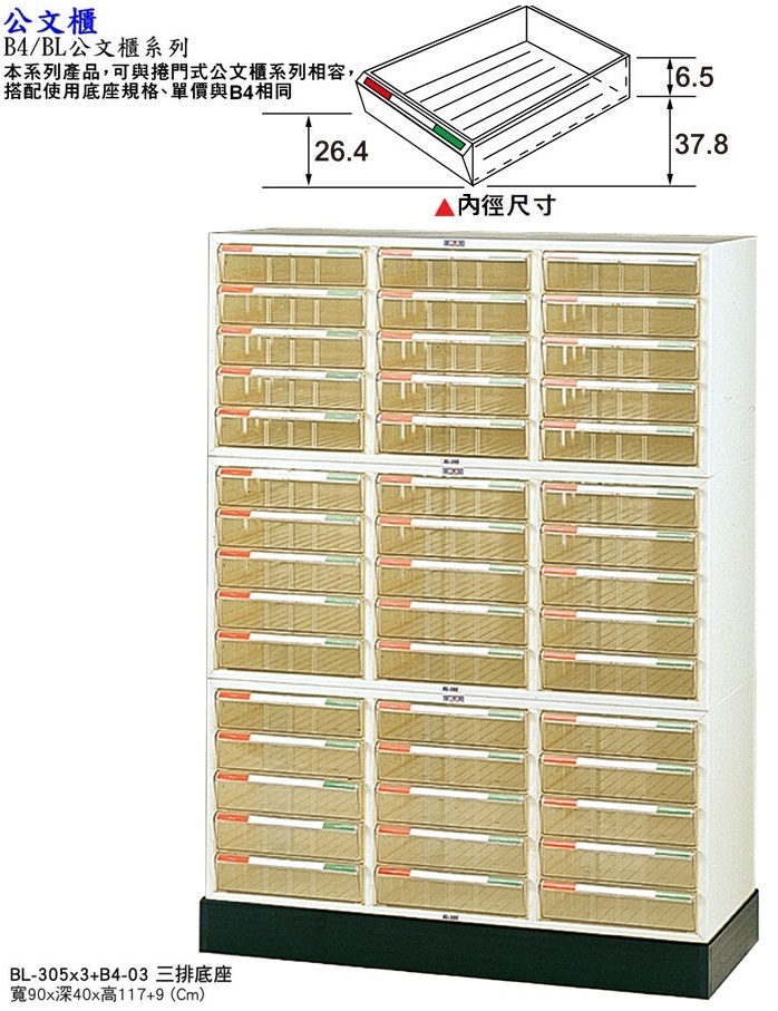 [BL-305x3+B4-03 三排文件櫃+底座]. 寬90x深40x高117+9(Cm). 商品說明:整體採用塑鋼PVC材質,完美塑身精製耐用。防塵、防潮,永保如新,實用美觀。不佔空間,單品組合堆疊,輕鬆、簡易,追加擴充方便。各種形式,均可自由增減,可依實際需要陸續分批購置避免浪費。專為台灣海島型氣候設計,自然的色系,室內室外皆合用,公司行號及居家均適用。
