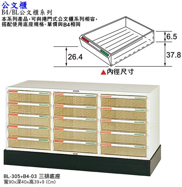 [BL-305+B4-03 三排文件櫃+底座]. 寬90x深40x高39+9(Cm).
