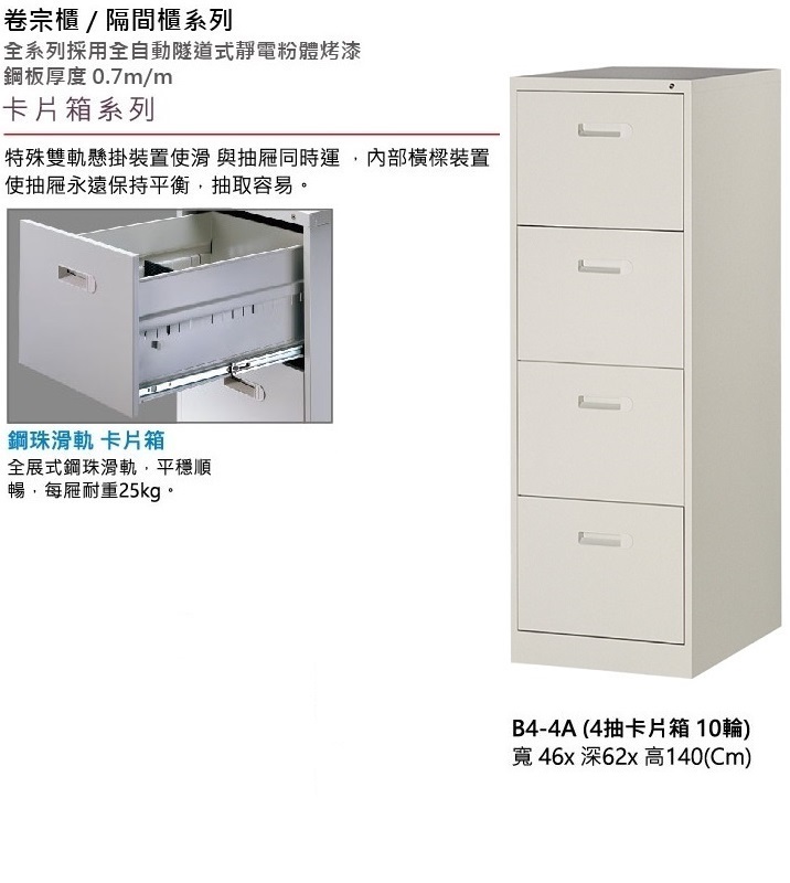 B4-4A(4抽卡片箱10輪).  寬 46x 深62x 高140(Cm).  ※全系列採用全自動隧道式靜電粉體烤漆.  ※905色(灰色)鋼板厚度0.7m/m.