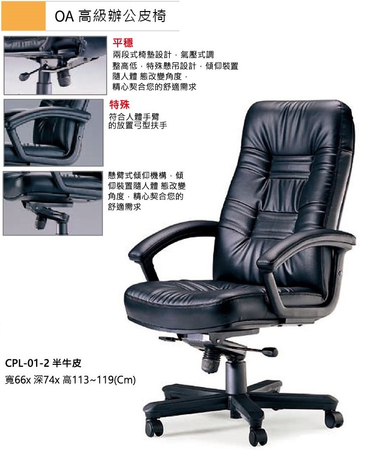 半牛皮. ※特殊 符合人體手臂的放置弓型扶手式(懸臂式傾仰機構,傾仰裝置隨人體 態改變角度,精心契合您的舒適需求). 寬66x 深74x 高113~119(Cm). ※屬性:組裝完成產品.